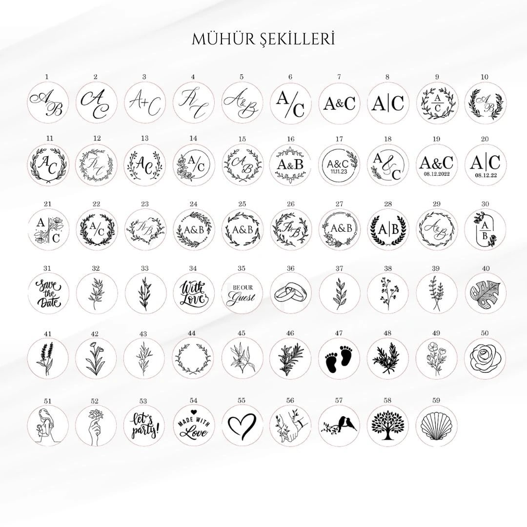 BANS DAVETİYE, MÜHÜR TASARIMLARINDA 60’A YAKIN MÜHÜR ŞEKLİ SUNAR. İSİM BAŞ HARFLERİNDEN OLUŞAN MONOGRAMLAR, ÇİÇEK MOTİFLERİ, TARİH BASKILI MODELLER, KALP, YAPRAK, ZEYTİN DALI, AĞAÇ, KABUK VE MİNİMAL ÇİZGİLER GİBİ ONLARCA ALTERNATİF ARASINDAN SEÇİM YAPILABİLİR. BU SAYEDE HER ÇİFT, KENDİ TARZINI YANSITAN ÖZEL BİR MÜHÜR TASARIMINA SAHİP OLUR.