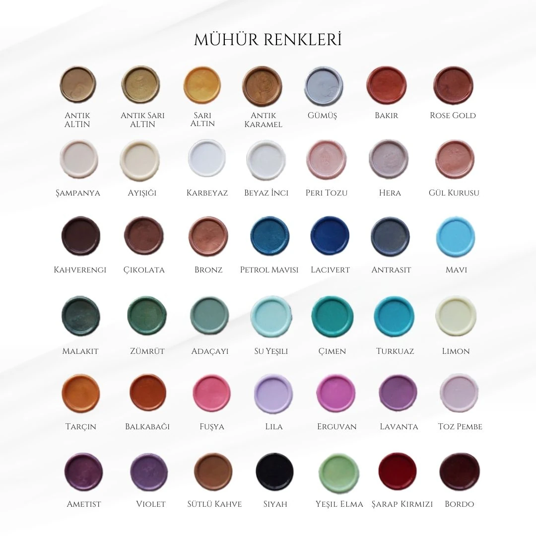 MÜHÜR KOLEKSİYONUMUZDA 40’TAN FAZLA RENK ALTERNATİFİ BULUNUYOR: ANTİK ALTIN, ROSE GOLD, GÜMÜŞ, ŞAMPANYA, KAHVERENGİ, BRONZ, PETROL MAVİSİ, ZÜMRÜT, SU YEŞİLİ, LİLA, LAVANTA, BORDO, ŞARAP KIRMIZISI VE DAHA BİRÇOK ÖZEL TON… HER BİRİ FARKLI KONSEPTLERE UYUM SAĞLAYACAK ŞEKİLDE HAZIRLANMIŞTIR. ÖRNEĞİN, RUSTİK DÜĞÜNLERDE BRONZ VE ÇİKOLATA TONLARI ÖNE ÇIKARKEN; ZARİF SALON DÜĞÜNLERİNDE ANTİK ALTIN VE GÜMÜŞ EN ÇOK TERCİH EDİLEN RENKLERDİR.